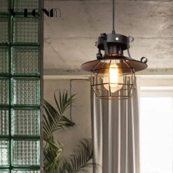 Suspension LED Demi Boule Style Industriel Avec Support En Bos